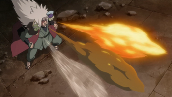 A hasznl kil egy nagy adag varangy olajat, Shima egy tz elem jutsuval meggyjtja, majd Fukasaku egy szl elem jutsu segtsgvel sztterjeszti ezt a tbb 1000 fokos lngtengert.
