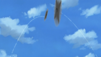 A hasznl felugrik az gbe az esernyjvel, majd az ernyt kinyitva Senbon zport enged az alatta lvkre