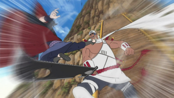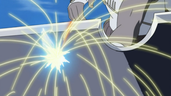 A hasznl mindkt kezvel megfogja a kardjt, majd egy vgst indt el, amit egy kk chakrahullm kvet.