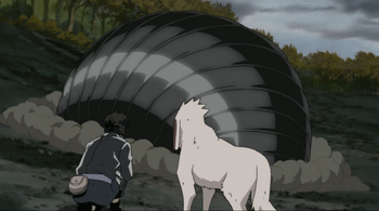 A hasznl egy erteljes pecst jutsut rak az oroszlnfej gyba majd az ellenflnek lvi azt.
